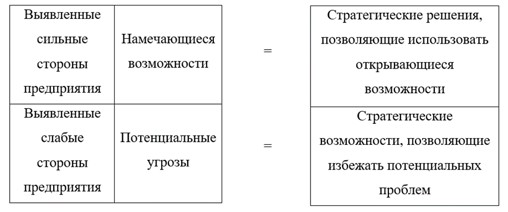 Разработка стратегии опирается на аналитический инструментарий. Использование портфельного анализа (к примеру, матрицы BCG) и совмещенного ABC/XYZ-анализа помогает оптимизировать продуктовый ассортимент и управление запасами. [2; 3] Ключевым синтетическим методом служит SWOT-анализ, который, как показано на рисунке 1, систематизирует внутренние и внешние факторы для выработки согласованных действий. Особую роль играет оценка уровня рыночной ориентации компании с применением специальных методик, измеряющих степень клиентоцентричности и выявляющих внутренние противоречия в восприятии рынка. [2; 6]