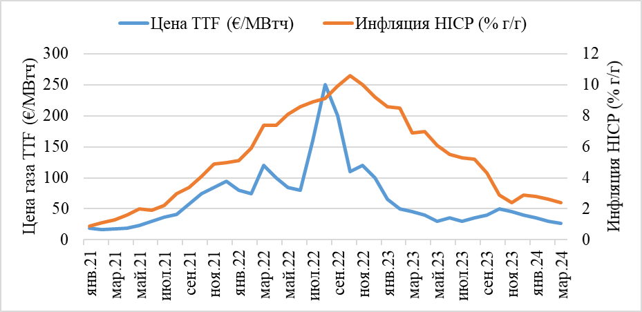 Рисунок 2 – Корреляция между ценой газа TTF и инфляцией HICP в Еврозоне