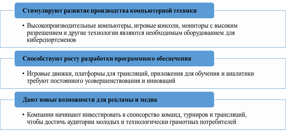 Индустрия стимулирует развитие IT-инфраструктуры, производство оборудования и программного обеспечения, тем самым ускоряя процесс цифровой трансформации всей экономики. Рисунок 2 наглядно демонстрирует перечень эффектов, которые киберспорт и игровая индустрия вносят в экономическое развитие России.