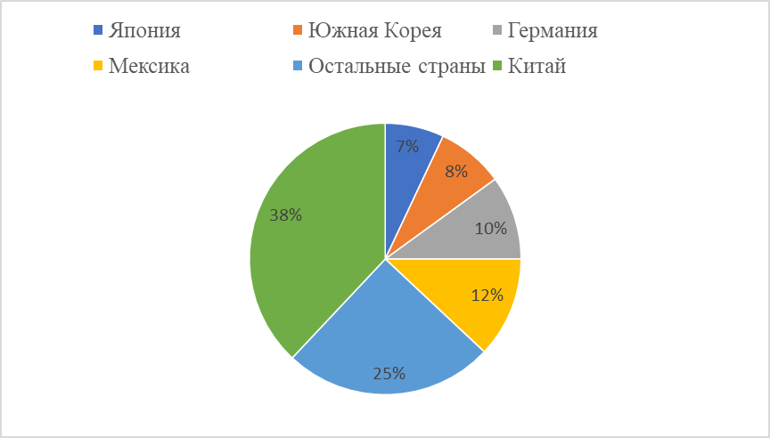 - Динамика и структура международной торговли электромобилями. Международная торговля электромобилями отличается высокой концентрацией в руках нескольких стран-экспортёров и усиливающимся протекционизмом со стороны крупнейших рынков. Китай сохраняет статус крупнейшего мирового экспортёра электромобилей с долей 38% по итогам 2024 года (рисунок 1). В 2023 году страна впервые вышла на первое место в мире по экспорту легковых автомобилей в целом, обогнав Германию преимущественно за счёт вывоза за рубеж электромобилей китайских компаний BYD, SAIC и Chery. Как следует из рисунка 1, крупными экспортерами электромобилей помимо Китая являются: Мексика (второе место в рейтинге с долей 12%), Германия (10%), Южная Корея (8%) и Япония (пятое место а мире с долей 7%).