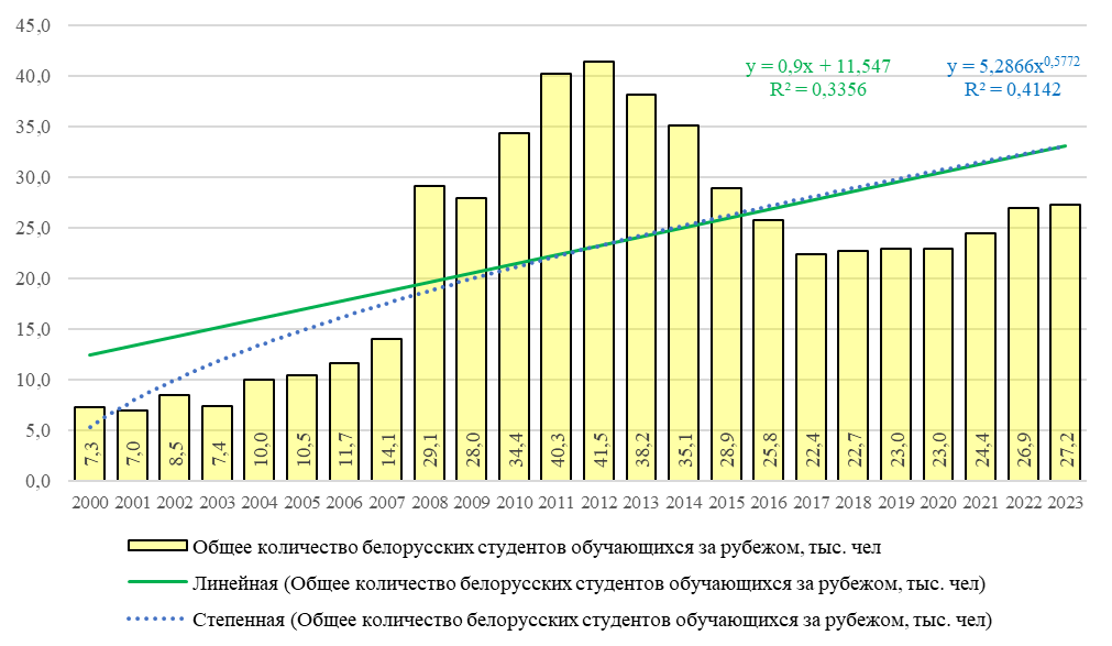 Как показывают проведённые исследования, резкое увеличение числа белорусских студентов, обучающихся за пределами своей страны, стартовало в 2008 году и достигло своего пика в 2012 году. После этого периода наблюдался небольшой спад, и численность стабилизировалась на уровне примерно 25–30 тысяч человек ежегодно [10]. Линейная модель (y=0,9x+11,547, R2=0,3356) фиксирует умеренный общий рост, но слабо отображает колебательные процессы. Напротив, степенная модель (y=5,2866x0,5772, R2=0,6635) значительно точнее характеризует реальные тенденции и подтверждает факт замедления динамики прироста белорусских студентов, выезжающих учиться за границу.