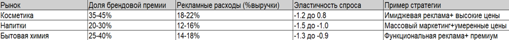 Анализ таблицы демонстрирует прямую связь между интенсивностью рекламы и величиной ценовой премии: на рынке косметики, где имиджевая реклама формирует эмоциональную лояльность, эластичность спроса минимальна, что позволяет лидерам вроде L’Oréal или Maybelline удерживать цены на 40% выше генериков при сопоставимом качестве. На рынке напитков реклама фокусируется на массовом охвате и ассоциациях с образом жизни, снижая чувствительность к цене на 30–35% и обеспечивая устойчивость позиций даже при росте затрат на сырье. В бытовой химии (Procter & Gamble бренды) комбинация функциональных преимуществ и брендового доверия даёт премию 30%, с эластичностью, падающей под влиянием ТВ-кампаний, что минимизирует риски от частных торговых марок