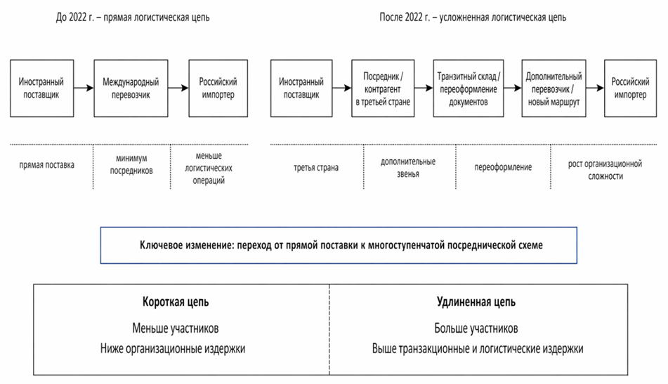 Переориентация внешнеторговых потоков сопровождалась усложнением самой цепи поставки. Рост числа звеньев означал дополнительные расходы на перевозку, брокерское сопровождение, складскую обработку, переоформление документов и страхование. Даже в тех случаях, когда происхождение товара не менялось, менялись маршрут, юридическая схема сделки и состав участников поставки. Поэтому ключевым результатом перестройки стало не только сохранение импорта, но и удорожание его логистической организации [4; 6; 13]. Этих изменения отображены в таблице.