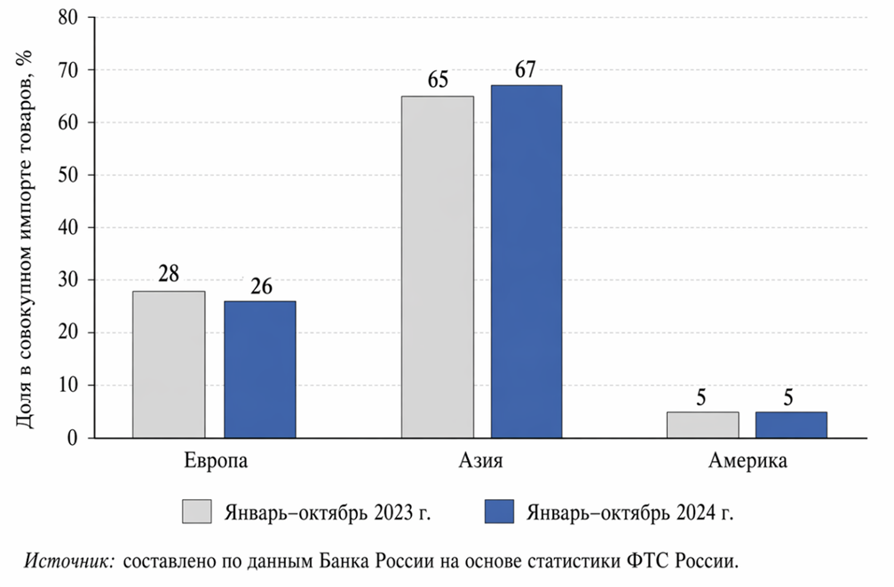К 2024 г. этот сдвиг закрепился в более широком азиатском контуре. Банк России указывает, что в январе–октябре 2024 г. доля Азии в совокупном импорте товаров достигла 67%, а доля Европы снизилась до 26%. Следовательно, китайское направление следует рассматривать не изолированно, а как ядро более широкой переориентации российской логистики на восточные маршруты, инфраструктуру и финансово-расчетные механизмы [3; 5].