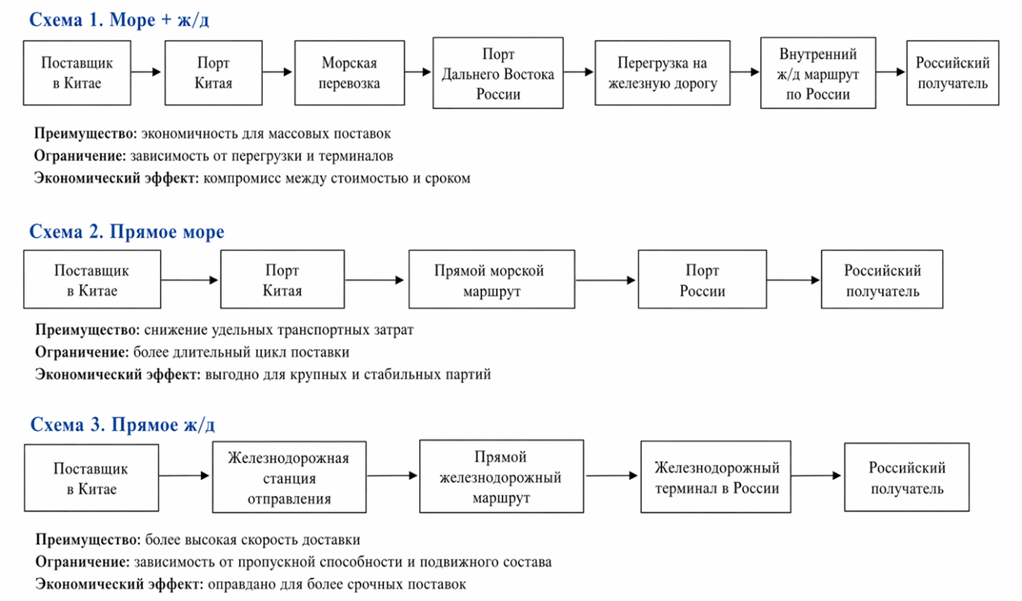 С точки зрения организации поставок китайское направление после 2022 г. стало опираться на три базовые модели. Первая – мультимодальная схема «море + железная дорога», в которой морская часть маршрута доводит груз до дальневосточных портов, после чего он перераспределяется по железной дороге во внутренние регионы России. Вторая – прямое морское сообщение, ориентированное прежде всего на крупные партии и на снижение удельных транспортных расходов при более длительном цикле поставки. Третья – прямые железнодорожные и иные сухопутные маршруты, значение которых усилилось по мере поворота торговли к наземным видам транспорта. Исследование K. Sikirinskaya и E. Ponomarenko прямо фиксирует смещение товарооборота к сухопутным видам транспорта, рост роли железнодорожного сообщения и развитие мультимодальных узлов на российско-китайском направлении [5; 12].