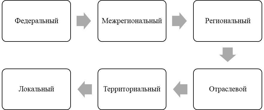 Федеральный уровень — это уровень, на котором устанавливаются основы регулирования отношений в сфере труда в стране. Межрегиональный уровень объединяет представителей в сфере труда в двух и более субъектах, региональный – внутри субъекта, отраслевой уровень включает представителей всей отрасли промышленности, для которой устанавливаются основы регулирования отношений в сфере труда. Локальный уровень – это уровень предприятия, на котором работники и работодатель устанавливают обязательства друг друга, на этом уровне составляются коллективные договоры, которые являются одной из форм социального партнерства [5].