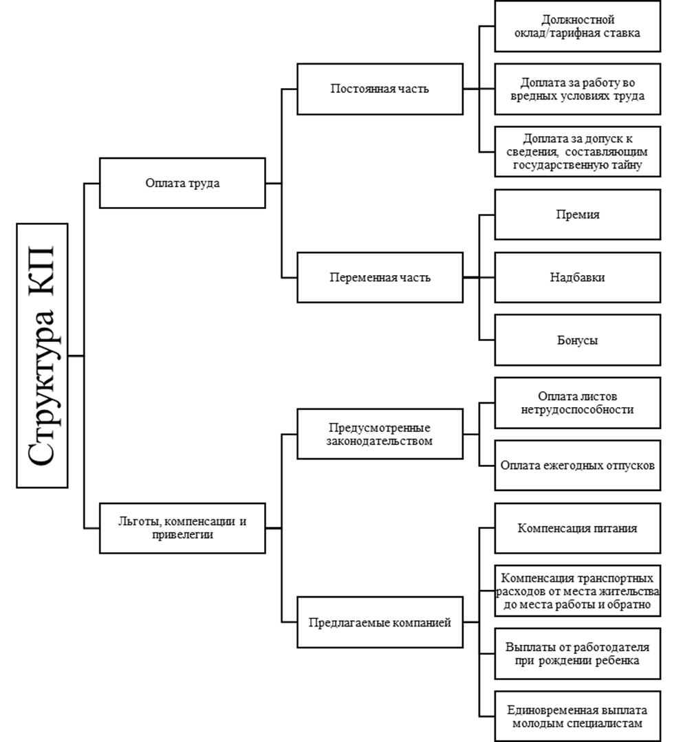 В настоящее время отсутствует единый подход к определению понятия «компенсационный пакет». Авторы считают, что наиболее полно понятие раскрыто в следующей трактовке: «компенсационный пакет – это комбинация выплат, льгот и пособий, предлагаемых работодателем своим сотрудникам». Такой пакет может включать в себя различные денежные премии и бонусы, разного рода страховые полисы, дополнительные дни к отпуску, гарантированные прибавки к заработной плате и прочие привилегии и льготы [3].