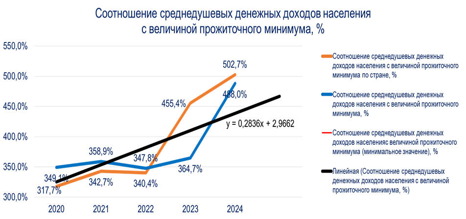Рис. 1. Соотношение среднедушевых денежных доходов населения с величиной прожиточного минимума.