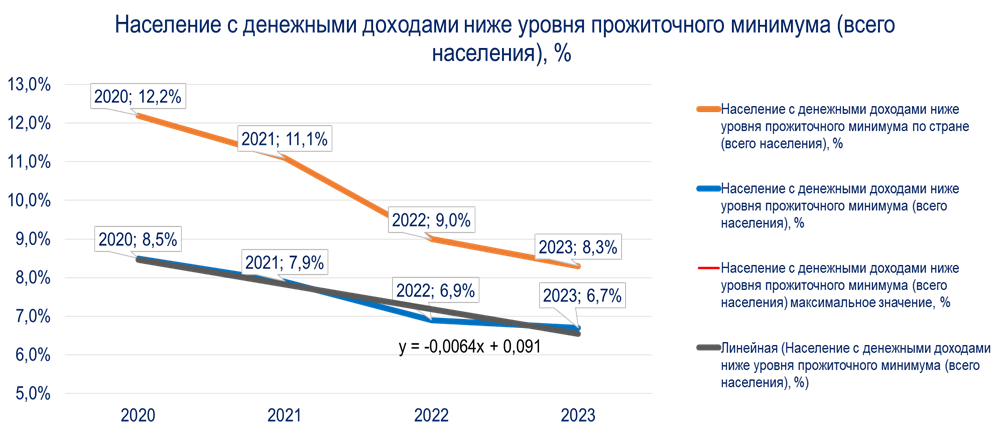 1. Население с денежными доходами ниже уровня прожиточного минимума:доля населения с доходами ниже прожиточного минимума в Воронежской области ниже, чем в среднем по России, и имеет тенденцию к снижению. Это свидетельствует об эффективности мер социальной поддержки. С 8,5% в 2020 году до 6,7% в 2023 году.