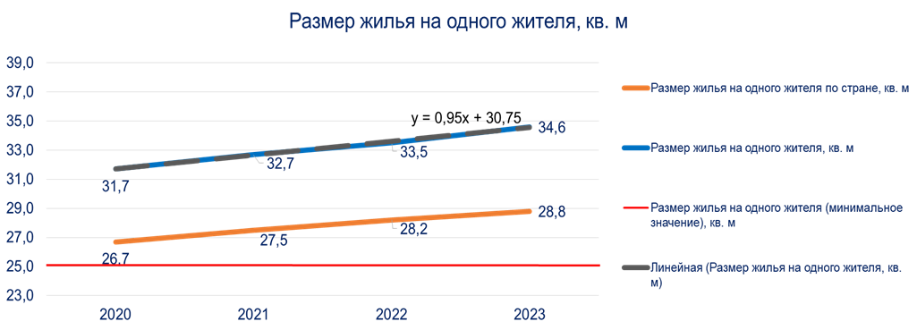 1. Размер жилья на одного жителя:обеспеченность жильём в Воронежской области выше, чем в среднем по стране, и имеет тенденцию к росту, что свидетельствует об улучшении жилищных условий населения. Рост с 31,7 кв. м в 2020 году до 34,6 кв. м в 2023 году.