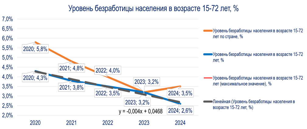 1. Уровень безработицы среди населения в возрасте от 15 до 72 лет:уровень безработицы в Воронежской области ниже, чем в среднем по стране, и имеет тенденцию к снижению, что говорит о стабильной ситуации на рынке труда. С 4,3% в 2020 году он снизился до 3,2% в 2023 году и незначительно вырос до 2,6% в 2024 году.